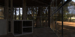 La estructura está conformada por vigas y columnas compuestas de pino Radiata, con anclajes metálicos visibles entre ellas. La envolvente es de vidrio con marcos metálicos. Cuenta con un ingreso y ventanas en sus cuatro lados. El espacio central se usó para colocar espacios de guardado y macetas, y la cubierta está levemente inclinada hacia cada lado.